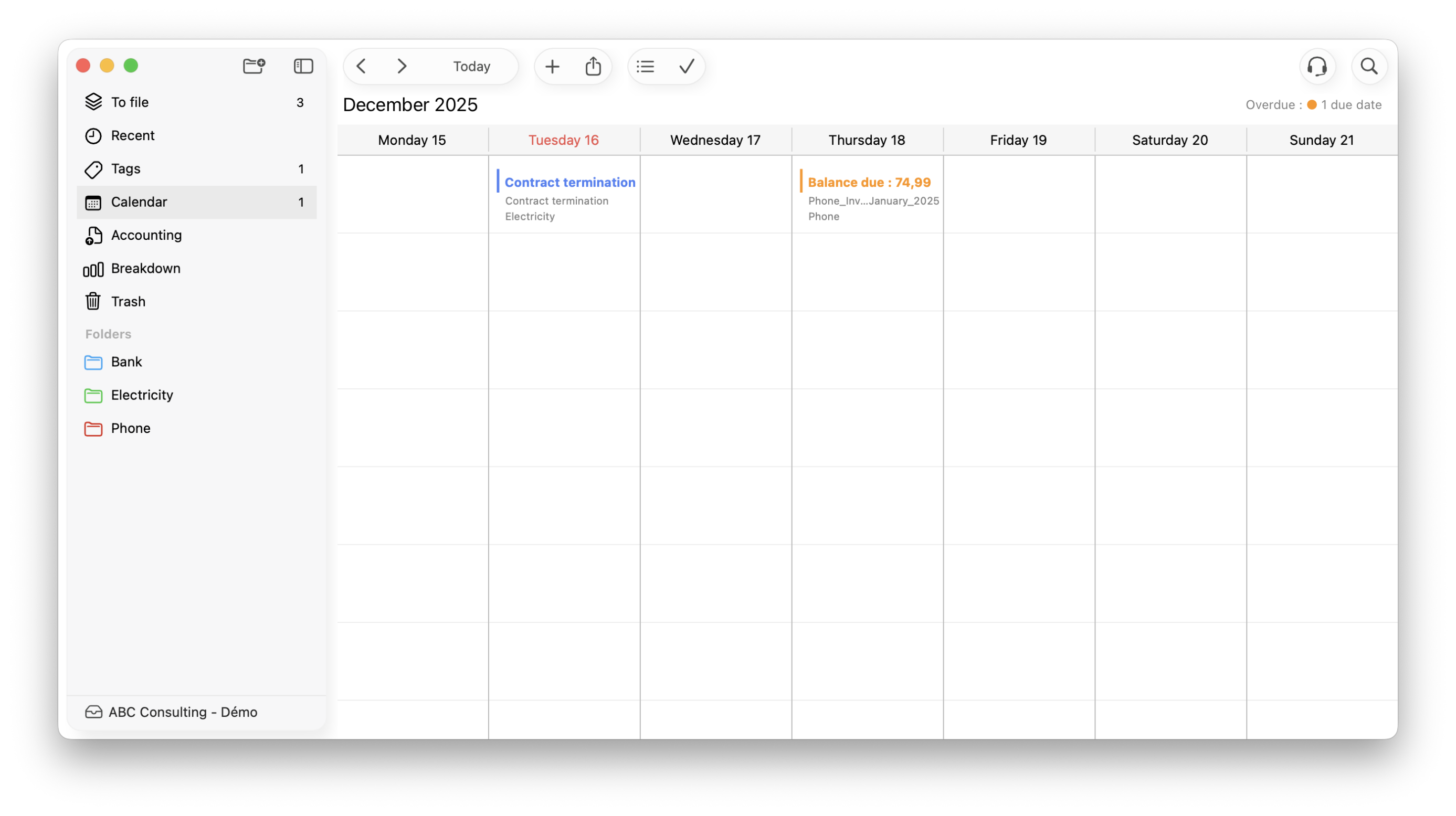 Thanks to the Calendar function, you can easily view all your weekly reminders and deadlines at a glance. Access related documents directly for even more efficient management. Synchronise with the Calendar application, ensuring you never miss an important appointment or critical deadline. Free your mind and concentrate on what's important.