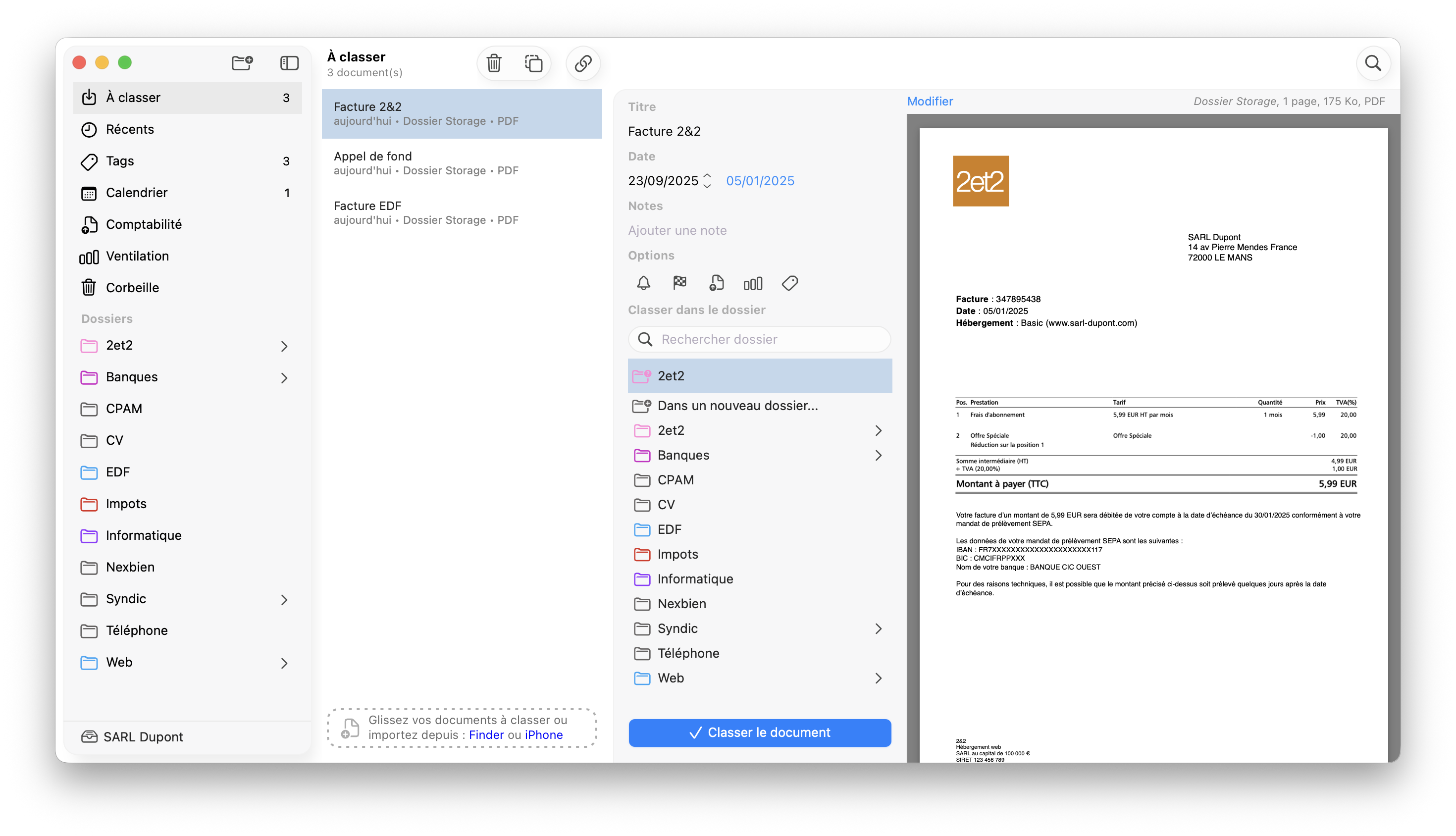 "À classer" importe tous les documents provenant par défaut du dossier "Dossier Storage" situé sur votre bureau. Vous pouvez modifier ce dossier depuis le menu "Fichier, Réglages du classeur..., À classer". Un dossier secondaire peut-être également configuré. Les formats suivants sont compatibles : PDF, JPG, PNG, DOCX, XLSX, PPTX, KEY, PAGES, NUMBERS et EML. Vous pouvez aussi importer les documents du dossier "Téléchargements" du Finder, depuis le menu "Fichier, Réglages du classeur..., À classer".