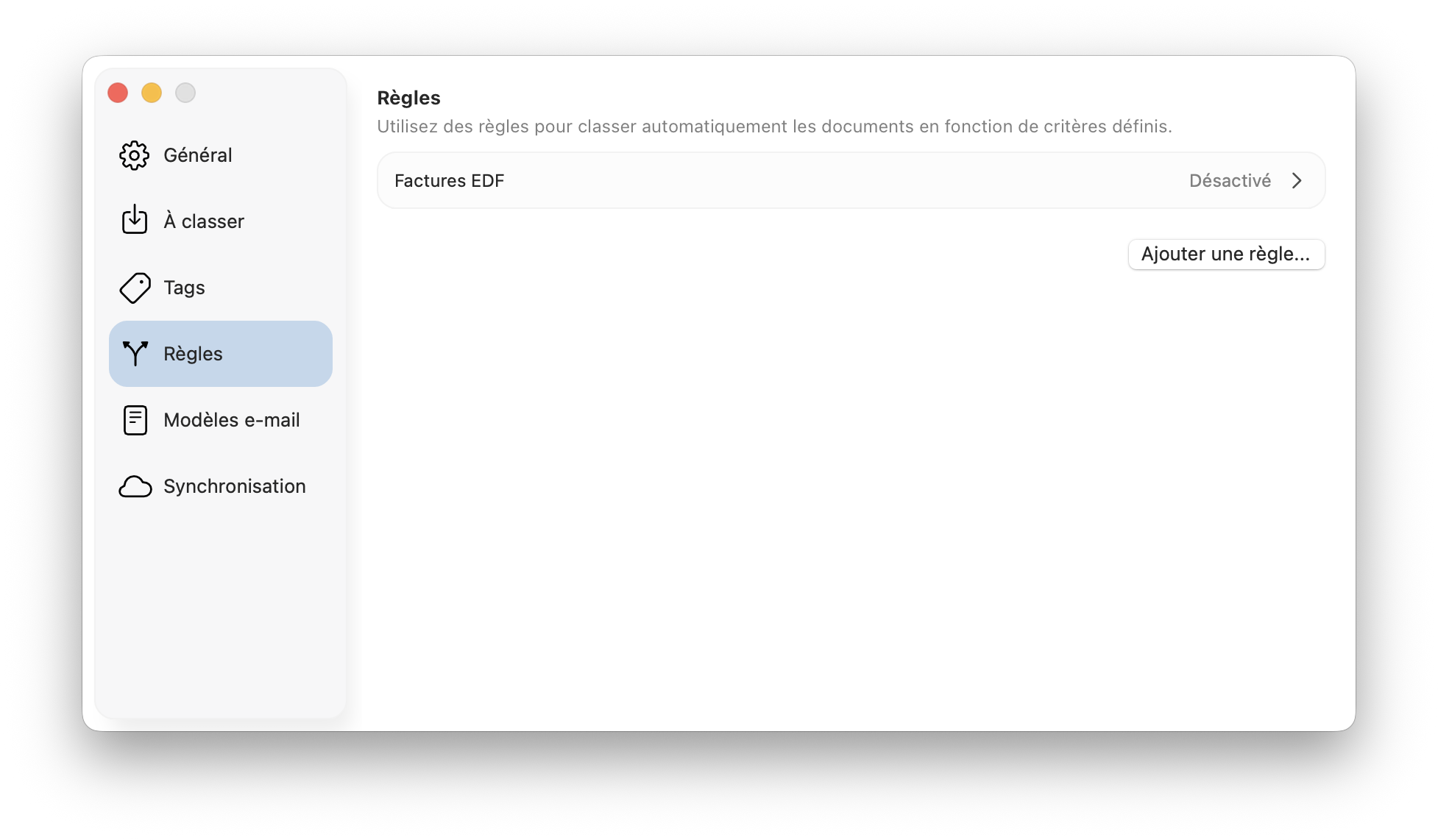 Vous pouvez par exemple créer une règle afin de classer automatiquement dans le dossier "EDF" tous les nouveaux documents dont le nom commence par "Facture_EDF".